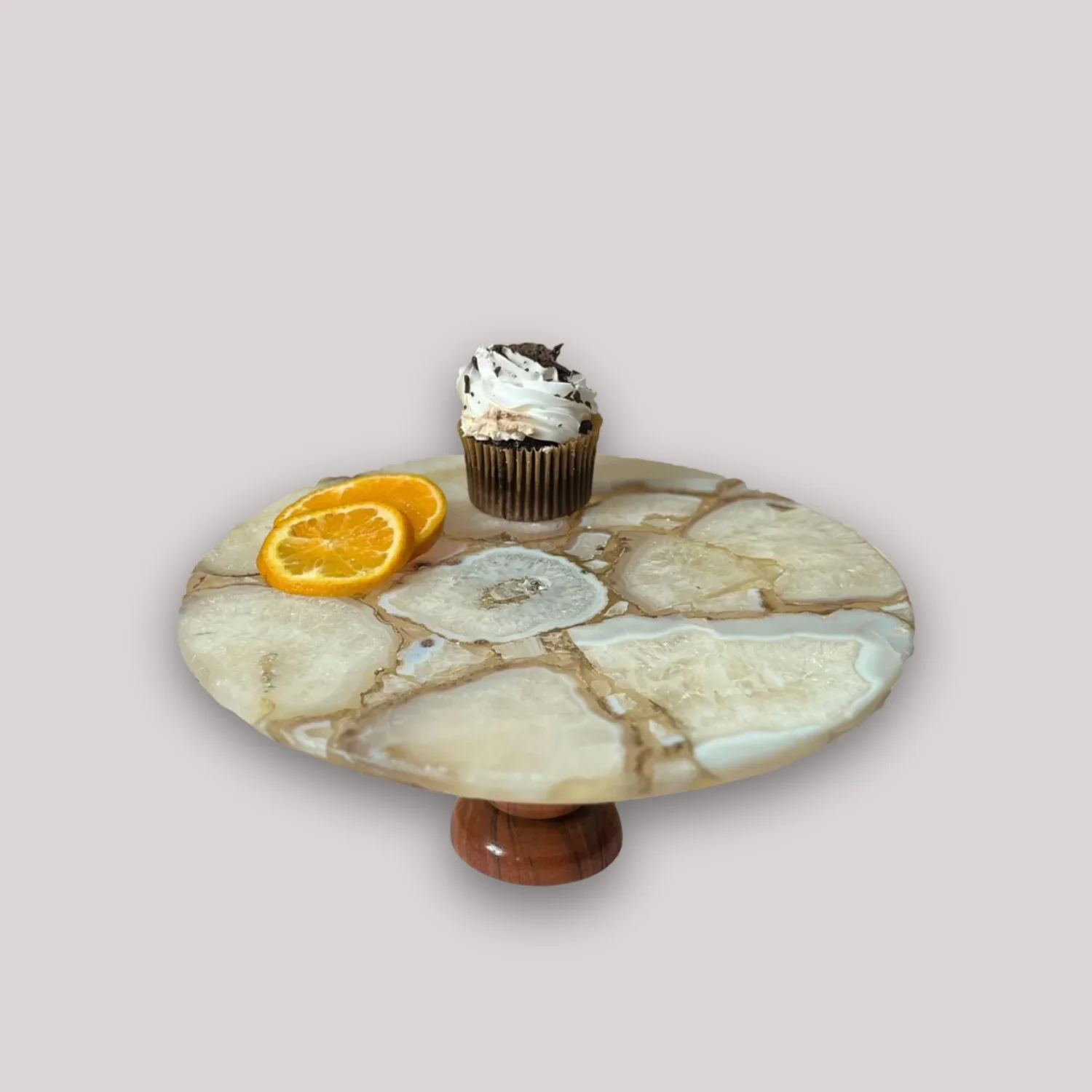The Agate Crest Cake Stand pairs a polished natural agate slice with your choice of a wood or metal base. Each stone top carries its own colour shifts and banding, so every stand is distinctive.