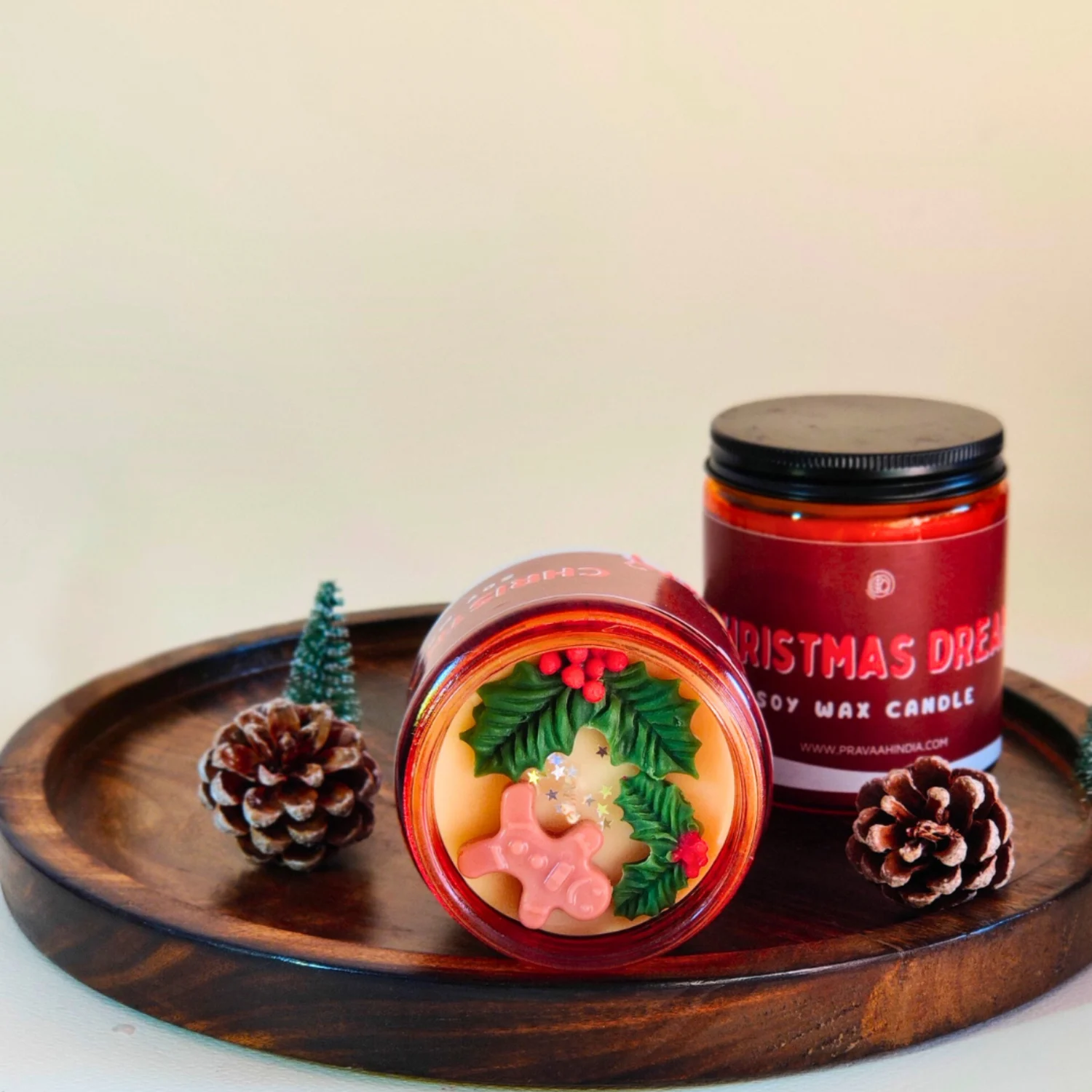 Set in a clear glass jar, each candle is finished with handcrafted wax details in the form of a gingerbread figure and mistletoe. These elements add a gentle festive note while keeping the overall aesthetic refined and uncluttered. When lit, the candle delivers a soft, steady glow and an even burn, making it suitable for quiet evenings, intimate gatherings, or moments of personal ritual.