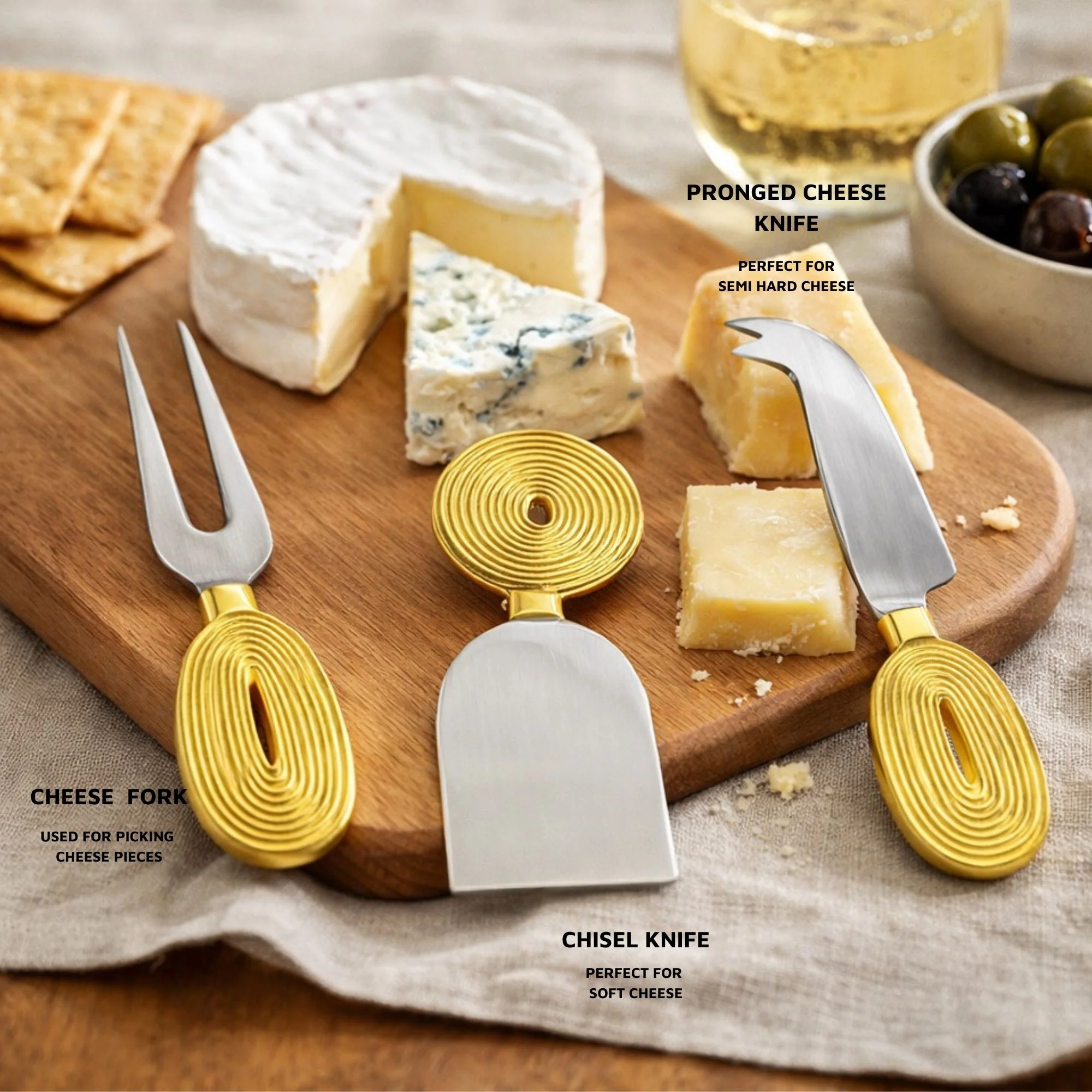 This three-piece set includes a fork-tipped knife, a flat cheese chisel, and a spreader – making it suitable for soft, semi-soft, and hard cheeses. The textured brass handles bring weight, warmth, and conversation to the table, while the sleek blades ensure ease of use.