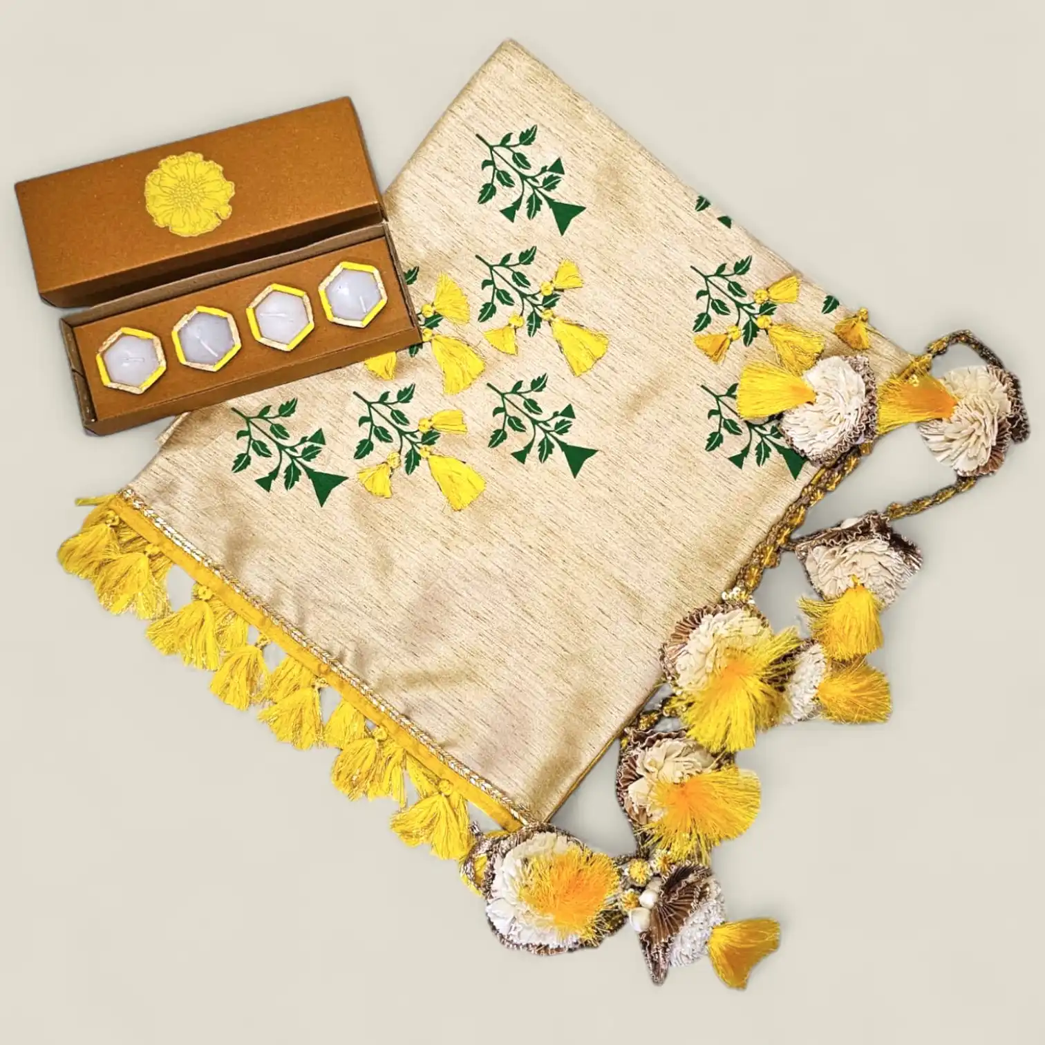 The Marigold Mini Hamper captures the essence of Diwali gifting – bright, thoughtful, and full of festive detail. Presented in a green gift box, this curated set is designed to bring joy into every home it enters. At its heart is a silk runner adorned with marigold motifs and tassels, setting the tone for a festive table. Complementing it is a handcrafted toran that frames doorways with color and celebration, inviting positivity and warmth.