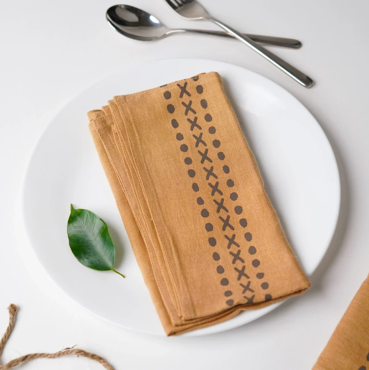 Introducing Kaincha, a refined 100% hemp table diners set inspired by the poetic journey of golden grass gently emerging from an olive-green landscape. Drawing from the serene beauty of the Northern Deccan Plateau, this collection captures the quiet magic of nature as the setting sun bathes the grasslands in warm, light-brown hues. The earthy tones and natural textures bring a sense of calm and understated elegance to your dining space, while delicate green lines woven into the design echo the scattered bursts of lush grass across the plains.
