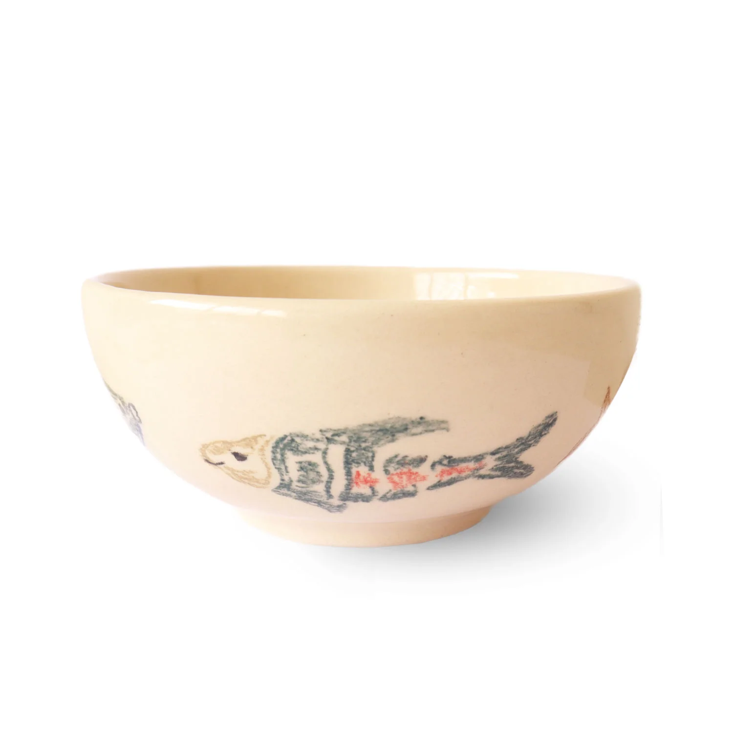 Each bowl features a whimsical doodle that is drawn by hand and repeated all the way around the surface of the bowl. A tiny fish, a star, a tree, or another simple motif becomes a small pattern that circles the piece. The design is drawn directly onto the clay before the final kiln firing, allowing the lines to settle permanently into the glaze.