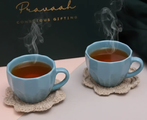 Saar Cups – Inspired by the Hindi word for “abstract,” these cups feature free-flowing, unique patterns meant to be felt, not defined. Perfectly sized for a comforting cup of tea, each sits naturally in your hands. Available in two calming pastels, microwave & dishwasher safe, and hand-glazed—each cup is one-of-a-kind, with slight variations adding to its charm.