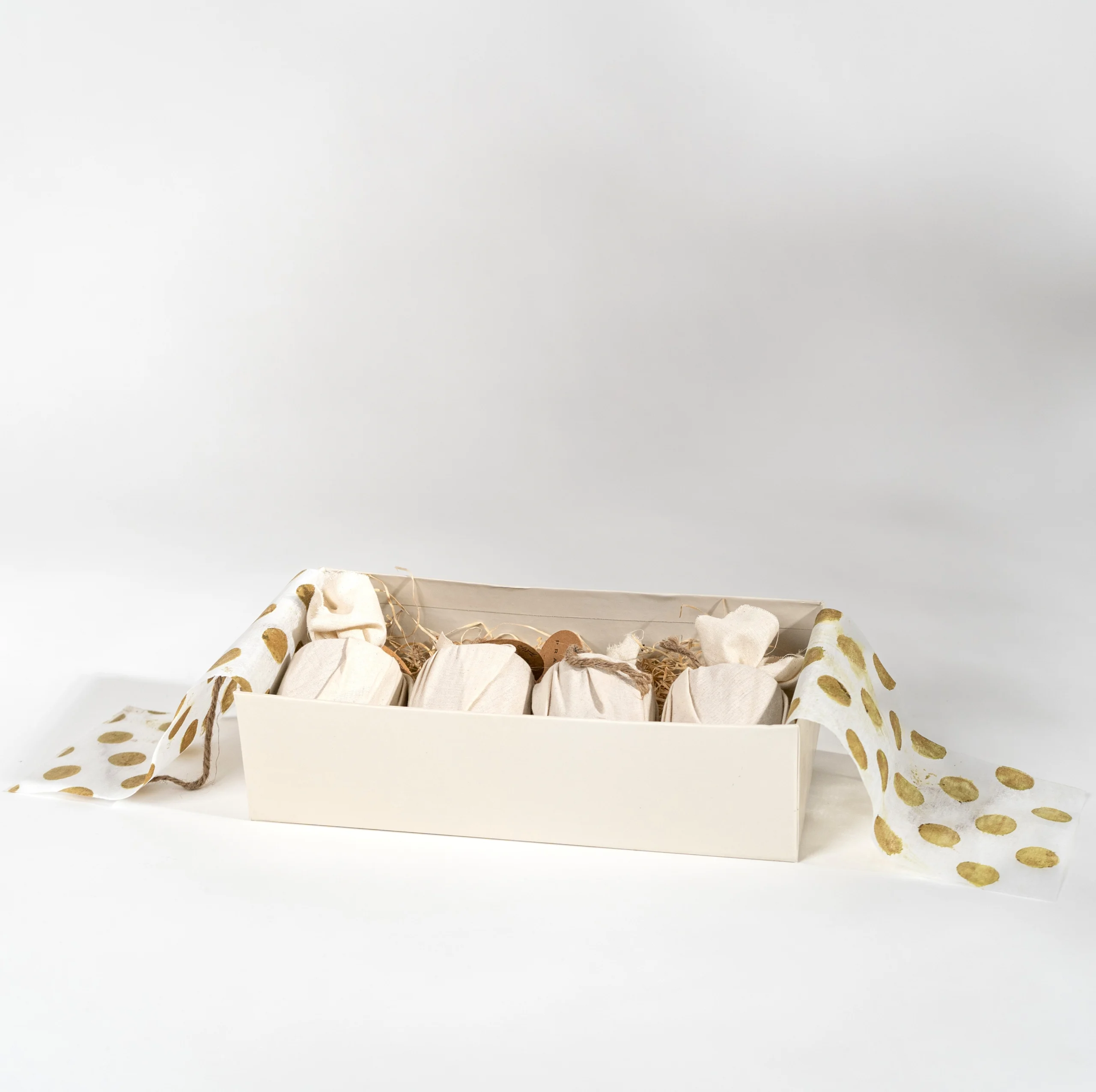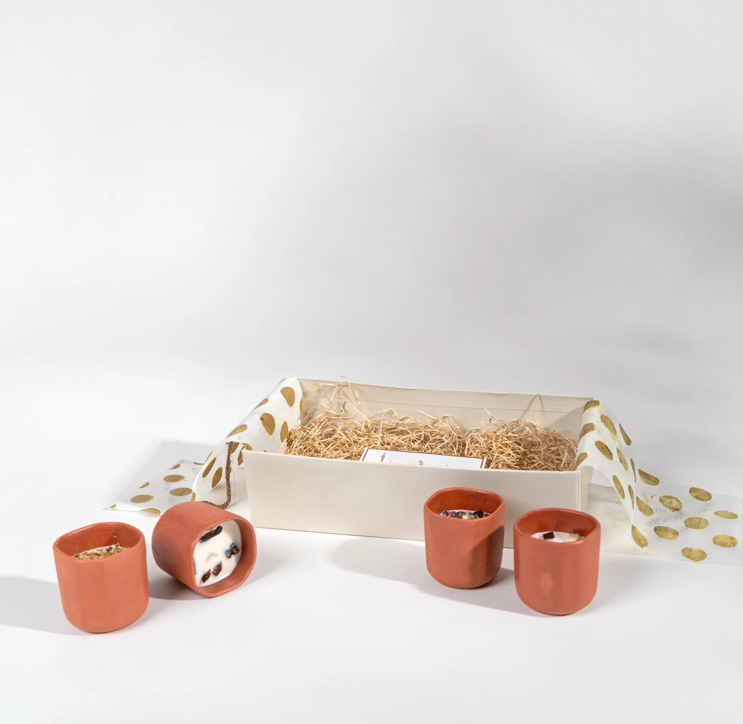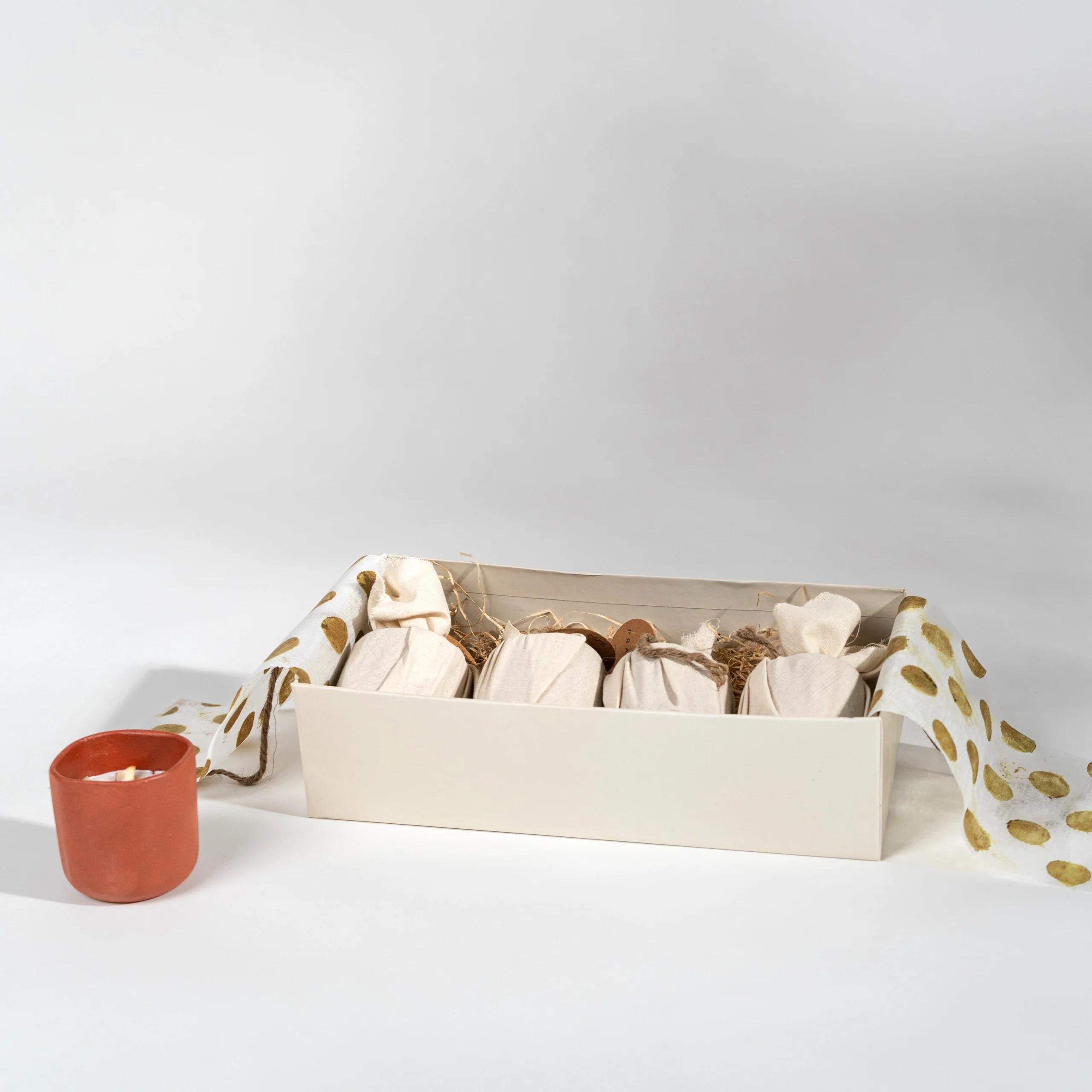 Celebrate the festival of lights with a beautifully curated, sustainable hamper featuring our best-selling, hand-poured soy wax candles in reusable terracotta jars. Infused with an exquisite set of fragrances—Cinnamon Vanilla, Sandalrose, Oud & Amber, Gilli Mitti, Narangi, and Mango Coconut—this festive collection is thoughtfully packed in our limited-edition gift boxes with a personalised message card for your loved ones.