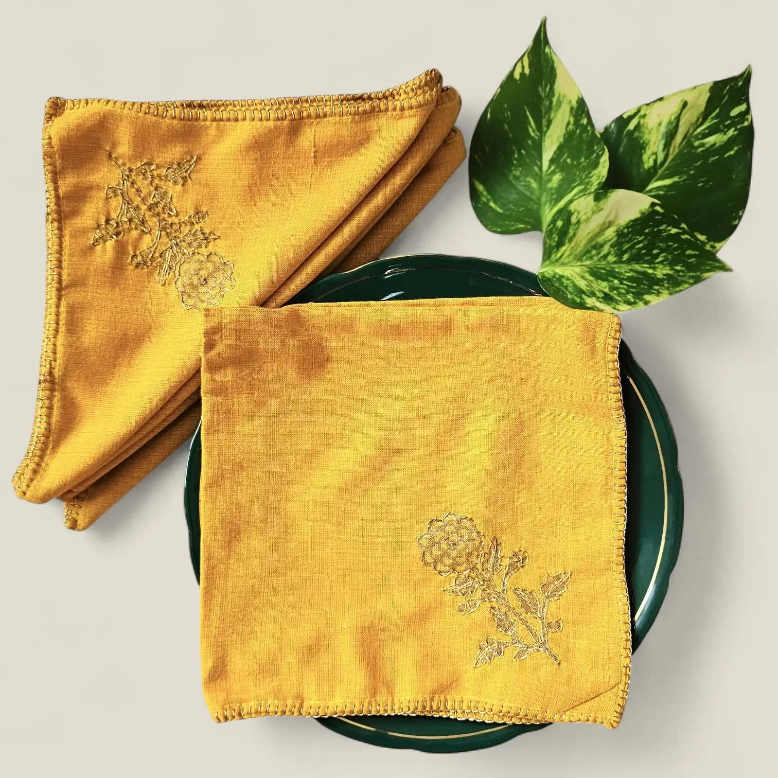 Hand-embroidered with care, each napkin carries the marigold motif in fine threadwork, set against a soft yellow cotton base. The embroidery is subtle yet full of character, making these napkins versatile enough for everyday meals and refined enough for festive occasions.