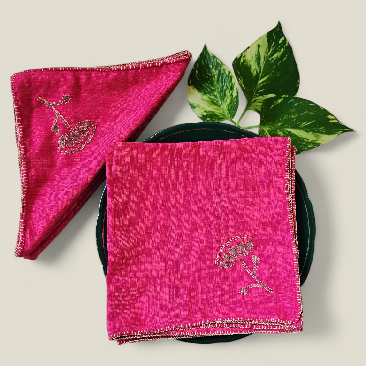 - Set of 6 cotton napkins in pink, with hand-embroidered lotus motif on each napkin